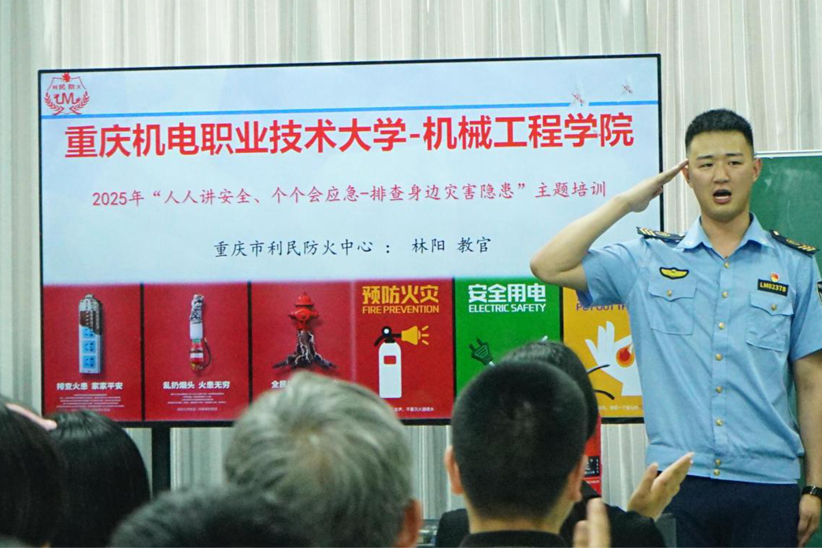 2025年5月23日下午,机械工程学院在D117教室开展“人人讲安全、个个会应急”消防安全专题培训,学院全体教职工参会,重庆市利民防火中心林阳教官担任主讲。