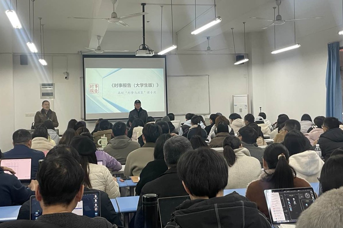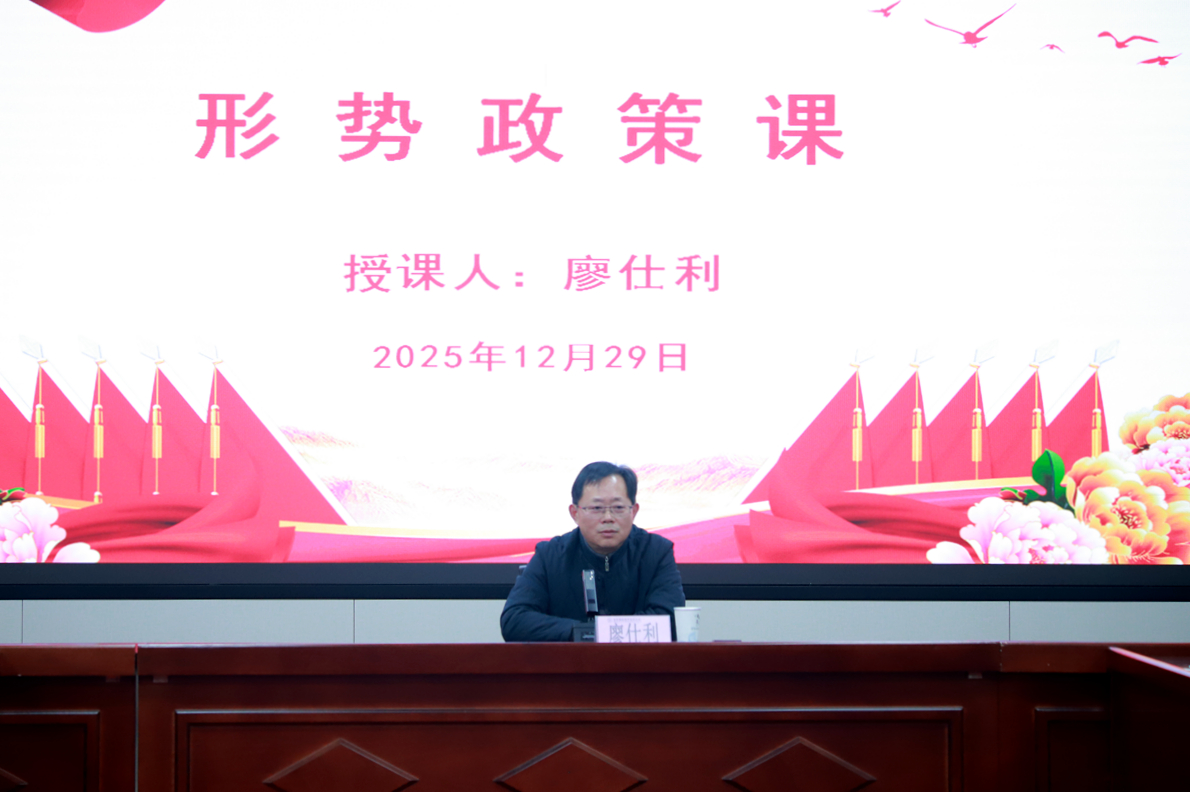 为准确把握国家发展大势,全面提升教职员工思想政治素养与爱国情怀,12月29日,校党委书记廖仕利在F107教室为经济与管理学院、通识教育学院、马克思主义学院教职员工作形势与政策专题报告。